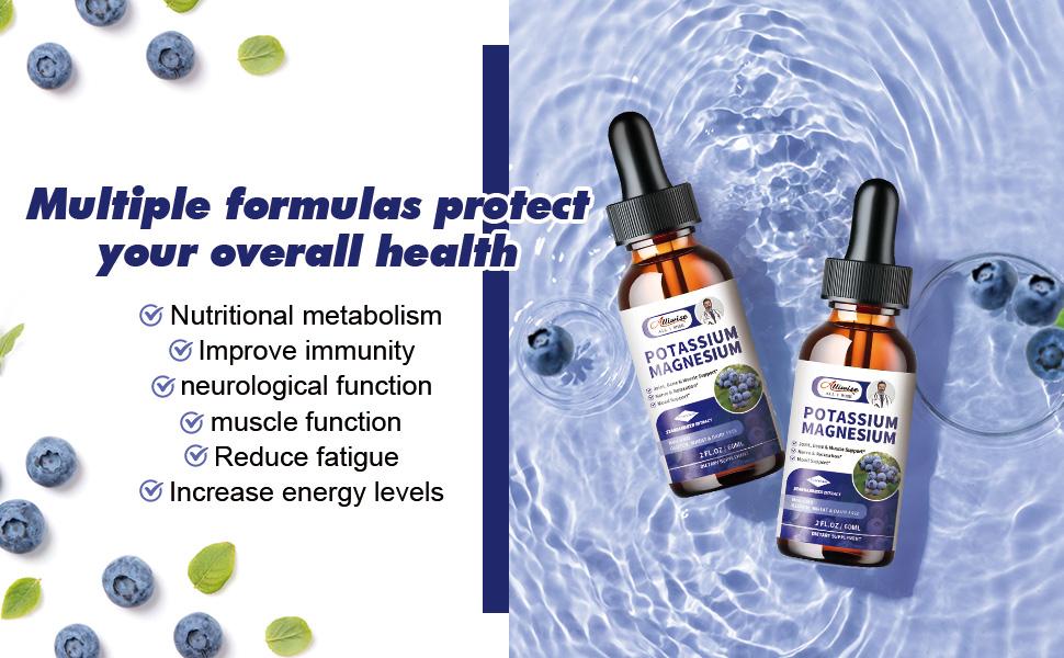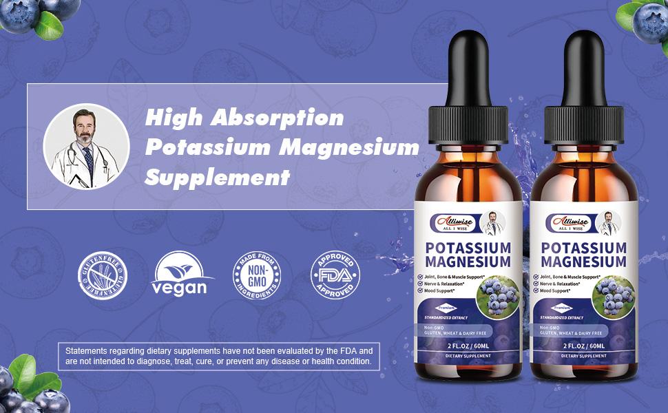 - NATURAL & VEGAN - For your health, all of the ingredients in our Blueberry Flavored Potassium Magnesium Drops are natural, non-GMO, gluten-free, have no artificial additives, sugar-free, and vegan. Packaged in two bottles for added convenience and great value, care for your health anytime, anywhere.