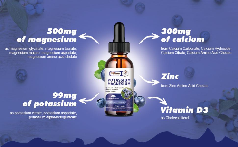 - MULTIPLE NUTRITIONAL FORMULA - Our Potassium Magnesium Drops have high-quality potassium and magnesium, totaling 500mg of magnesium complex, 99mg of potassium complex, 300mg of calcium complex, vitamin D3, and zinc. The ready-to-take potassium and magnesium drops are a great alternative to pills, capsules, or tablets with high absorption and bioavailability!